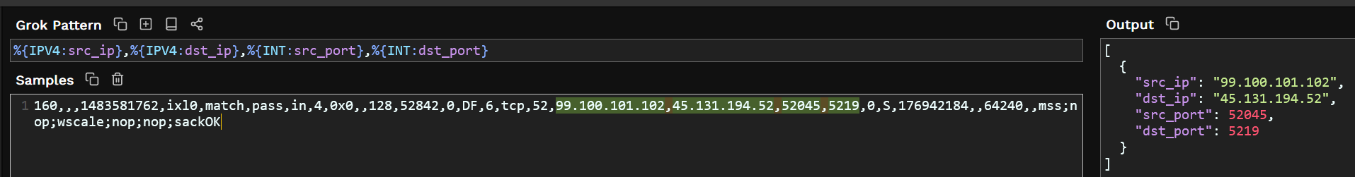 There are so many patterns built-in. We are going to use %{IPv4} and %{INT} to grab the details of the source IP, Destination IP, Source Port and Destination Port: